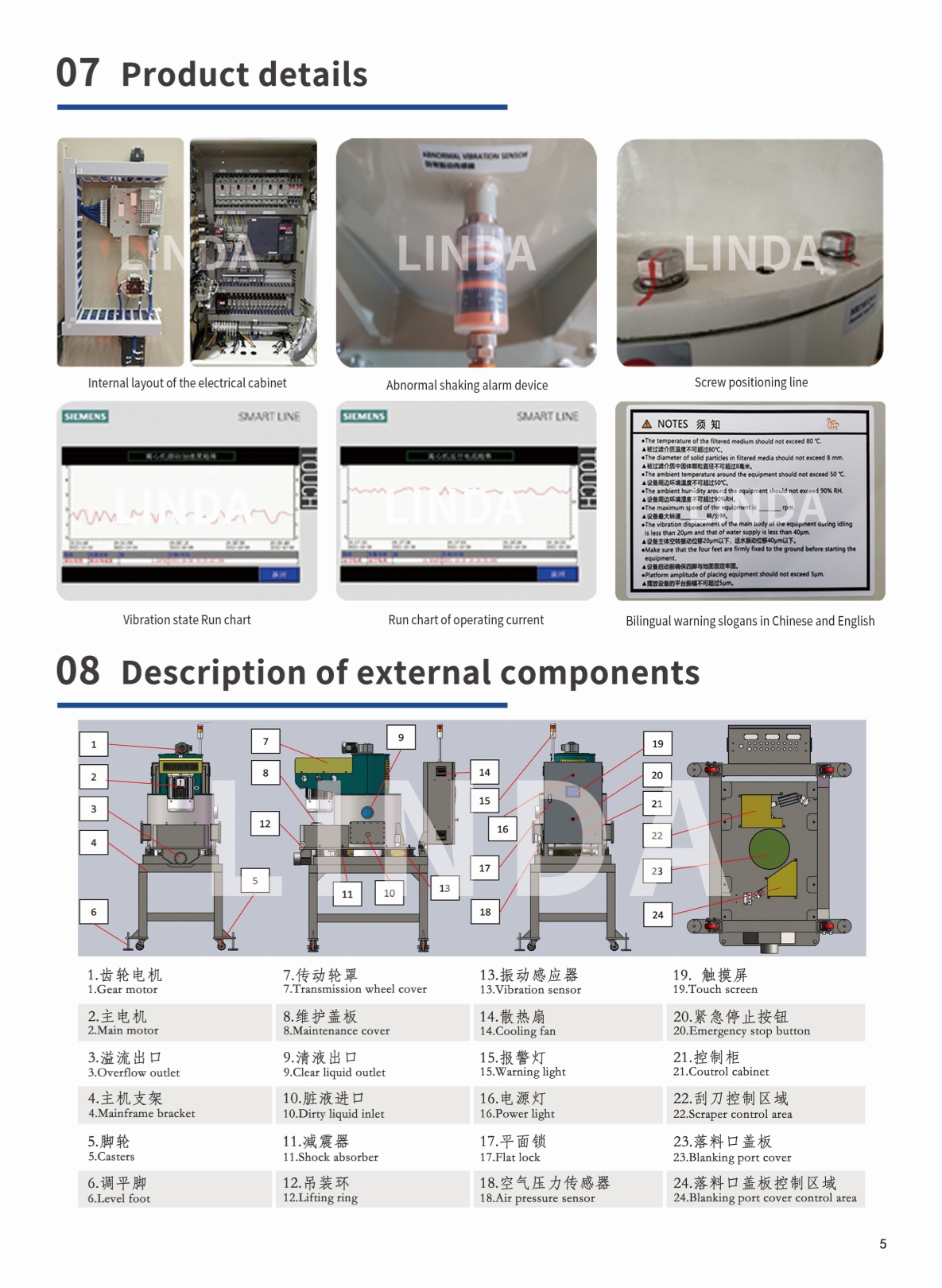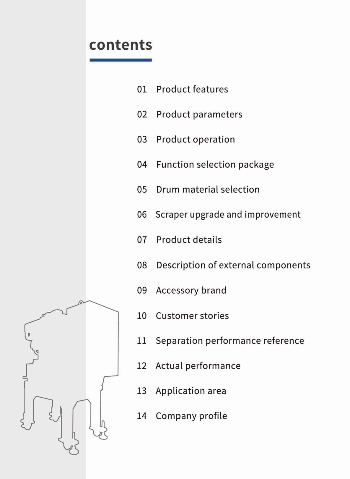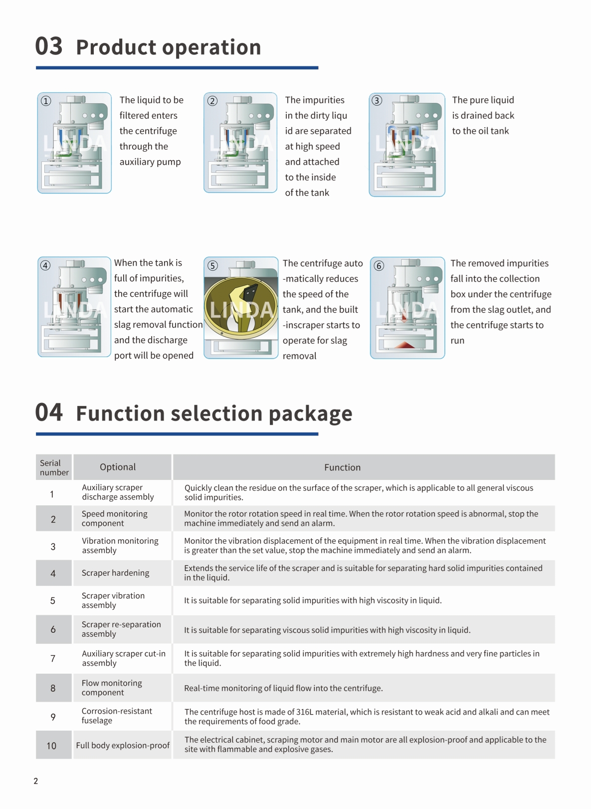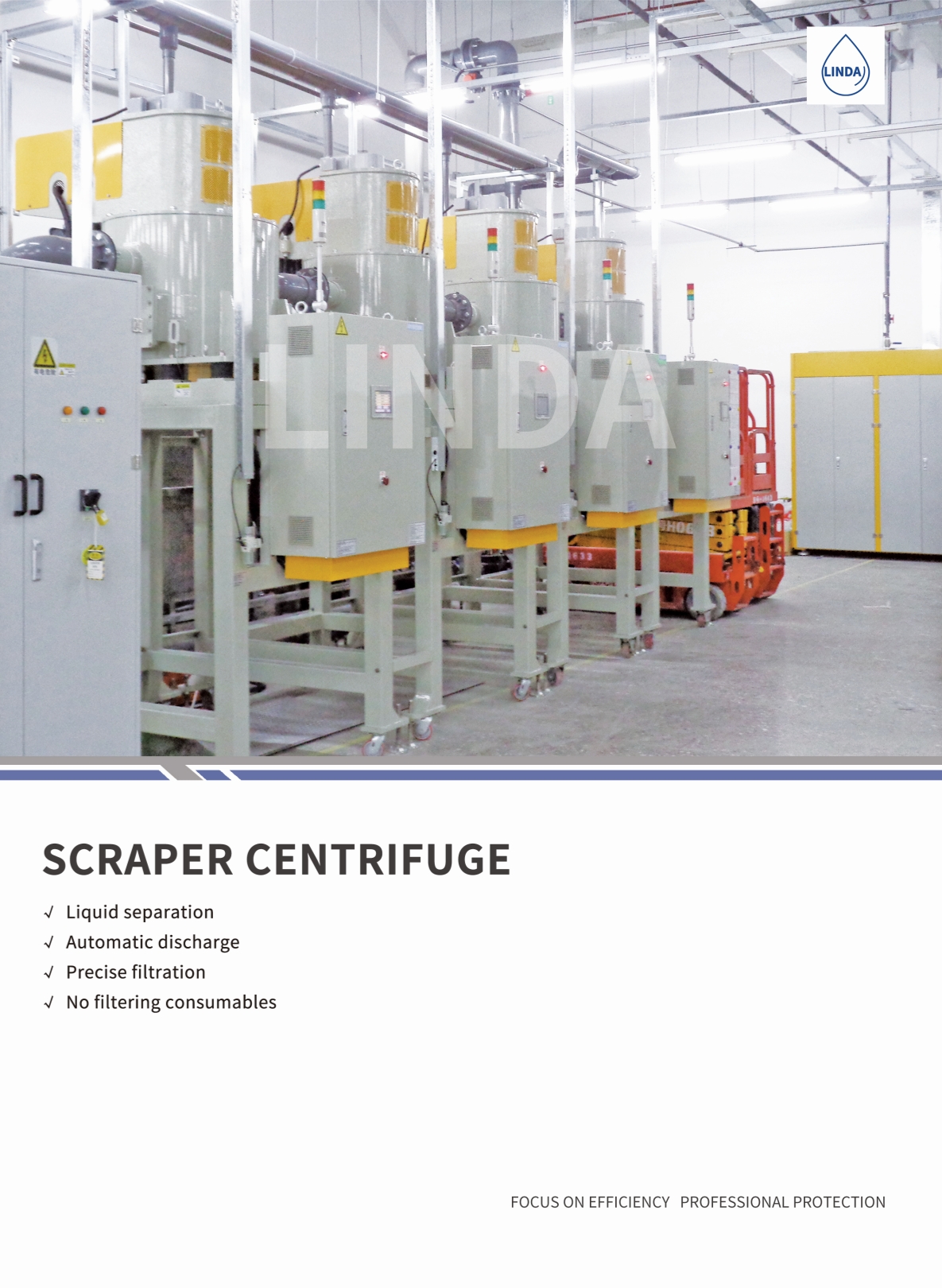 The filtration principle of vertical centrifugal + slag removal method of scraper discharge can be used to achieve consumable-free filtration and discharge of drier sludge (minimum 10% moisture content);